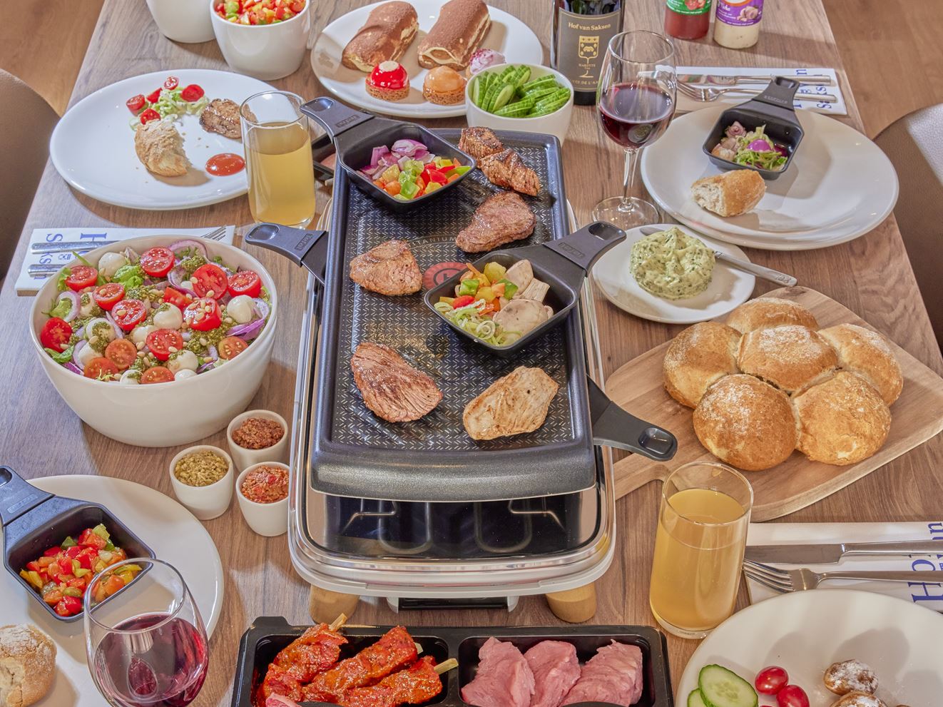 Raclette am Tisch gehört an den Feiertagen einfach dazu: Es macht Spaß und ist außerdem richtig lecker. Reserviere unser Arrangement „Kochen am Tisch“ für den 24. Dezember (Heiligabend), 25. Dezember (1. Weihnachtstag) oder 26. Dezember (2. Weihnachtstag) und erhalte ein besonders festliches Arrangement. Es sind verschiedene Arrangements erhältlich. Du hast die Wahl zwischen Fleisch, Fleisch und Wild, Fisch oder vegetarisch. Das Arrangement wird ergänzt durch Saucen, Gemüse, Salat, Baguette mit Kräuterbutter und natürlich die Nutzung eines Raclette-/Tischgrillgeräts mit allem notwendigen Zubehör. Das festliche „Kochen am Tisch“-Arrangement kostet € 31,50 für Erwachsene (p. P.) und € 13,50 pro Kind (bis 12 Jahre) und kann für zwei Erwachsene und mehr Personen gebucht werden. Das „Kochen am Tisch“-Arrangement ist in unserem Webshop buchbar.