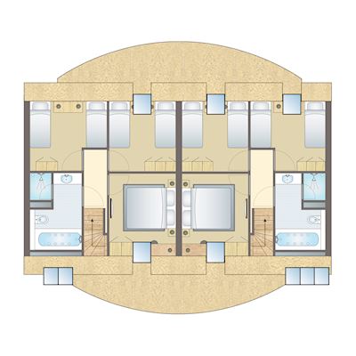 - Zwei Badezimmer mit jeweils Whirlpool, ebenerdiger Dusche, Regendusche und Waschbecken auf der ersten Etage